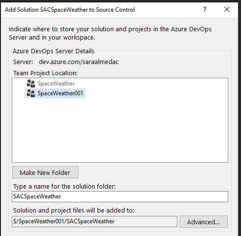 Once the mapping has completed you can adding your files into source control. Go to Solution Explorer, right click in your project and select Souce Control>Add Solution to Source Control.