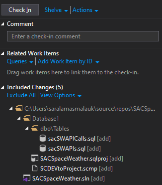 To publish your changes in the Azure DevOps repository (so it’s available for the rest of team members) you will need to Check In your code. Right click in your project again and select Source Control>Check In as below.