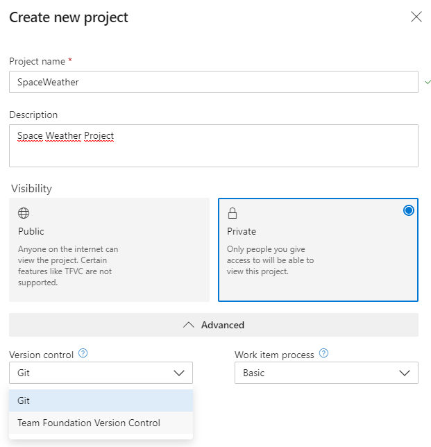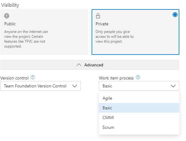 Also you will need to decide what process you are going to follow in your Work Items (tasks) as Azure will generate different process templates depending on your election. You can see the differences here.